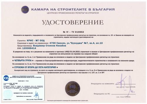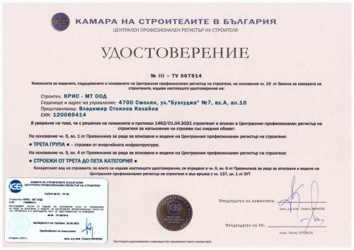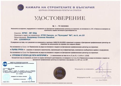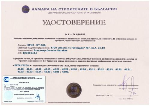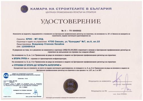 Начало / За нас / Сертификати / Лицензи / Удостоверения / Механизация / Обекти / Производствени бази / Контакти |